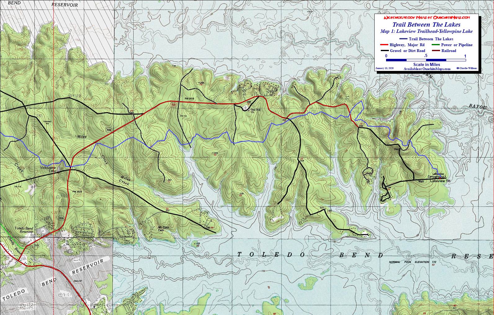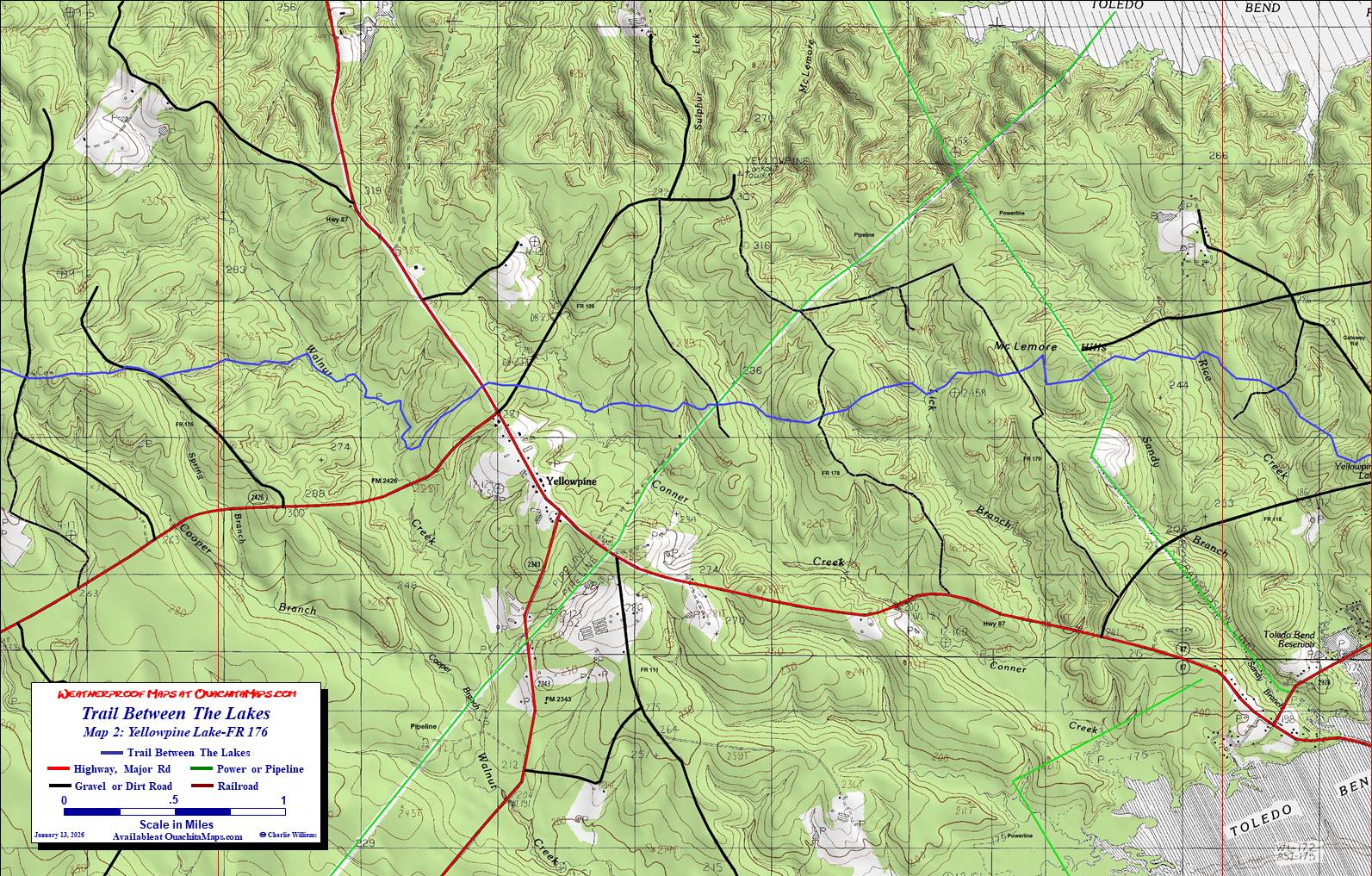 All of the maps have been enhanced. The highways and major Farm to Market roads are shown in red, other roads in black, power lines and pipelines in green and railroads in maroon. Google Earth was used to check the roads and add some lesser forest roads that don't appear on the topo. The roads have also been labeled.Trail Mileage. Click here for an Excel spreadsheet of the trail. There is an West to East and East to West version so it is ready to use regardless of your route. Since it is a "live" file you can sum your mileage to get a better idea of the length of your days. Check out column "C." By copying the formula in one of the cells to the beginning and ending location of a day and deleting the formulas in between, you can get subtotals.